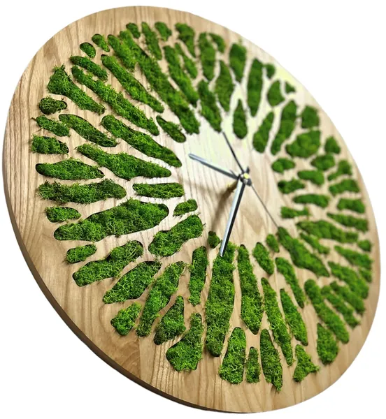 Nástěnné hodiny z přírodního dřeva a mechu do domácnosti (ložnice, obývací pokoj, kuchyně, koupelna, obývací pokoj, chodba) nebo kanceláře. Zázrak doplní klasický i moderní interiér. Původní autorský projekt. Mechové hodiny běží na jednu AA baterii (není součástí balení). Používáme tichý quartz strojek, díky kterému jsou hodiny prakticky tiché a neruší vás od vaší práce. Skvělý tip na dárek pro vaši matku, manželku, přítelkyni, šéfa nebo kolegyni. Dřevěné hodiny s mechem se hodí k výzdobě interiéru restaurace, kliniky, bytu, domu nebo kanceláře.
