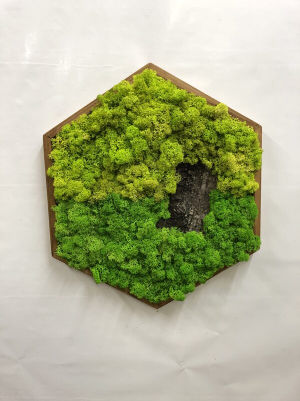 Tento hexagonální mechový obraz spojuje krásu přírody s moderním designem. Vytvořen z lišejníku, který je stabilizovaný, a kůry, tento obraz přináší do vašeho domova jedinečnou harmonii a klid. Ideální pro každého, kdo hledá ekologické a zároveň stylové řešení pro svou domácnost.