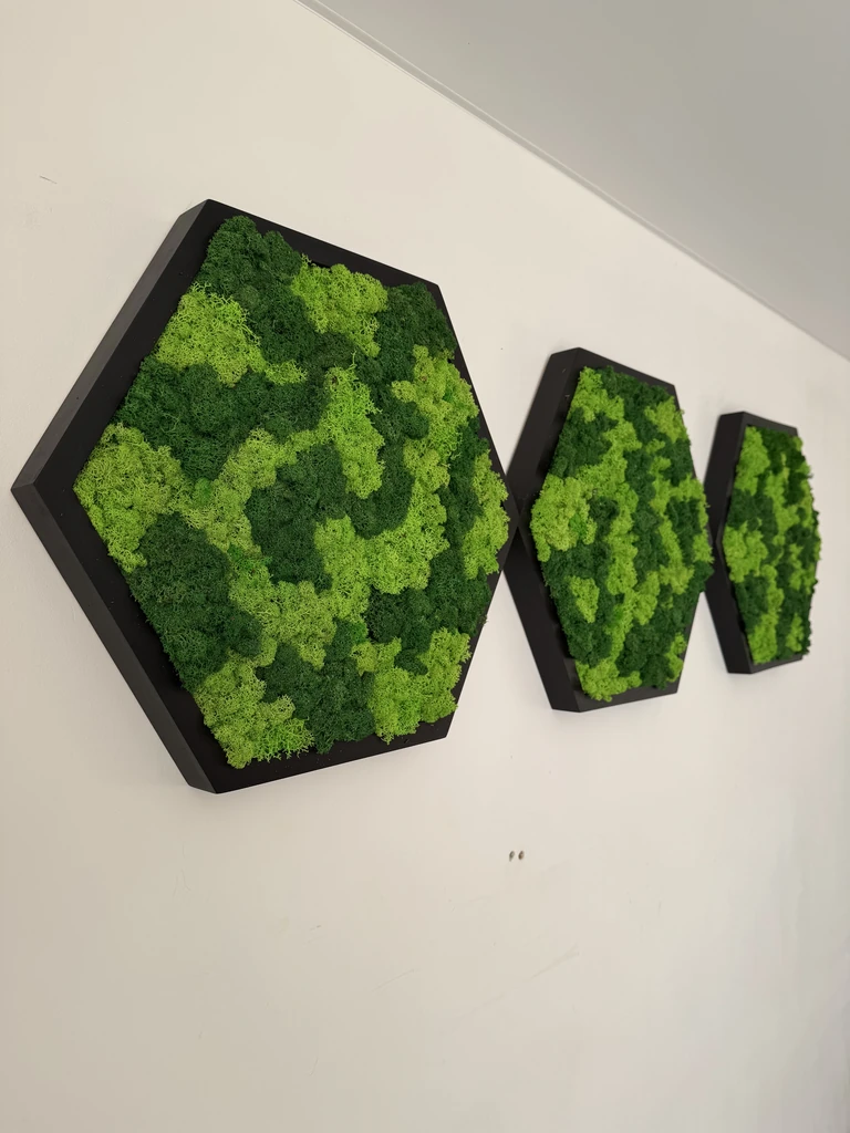 Hexagon Set Mechový Obraz s Sobí mech. Toto jedinečné umělecké dílo je úzce spojeno s přírodou a vnáší krásu přírody do vašeho domova.