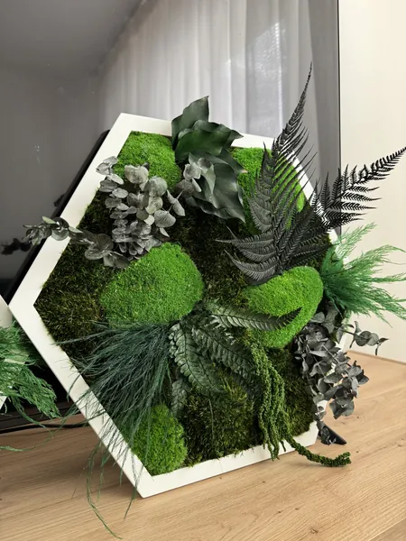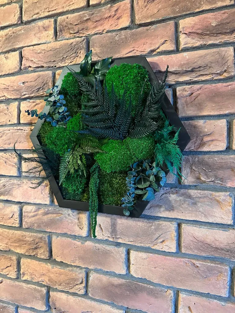 Naše hexagonální obrazy z mechu se skládají z harmonické směsi kulovitého mechu a přibližně čtyř dalších druhů konzervovaných rostlin. Kulovitý mech, známý také jako polštářový mech, tvoří základ obrazu a je doplněn jemnými listy kapradin, eukalyptu a dalšími pečlivě vybranými rostlinami, které si zachovávají svou přirozenou barvu a strukturu. Tato kombinace vytváří živé a zároveň nadčasové umělecké dílo, které se stane středem pozornosti v každém prostoru.