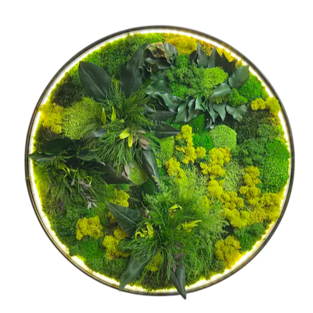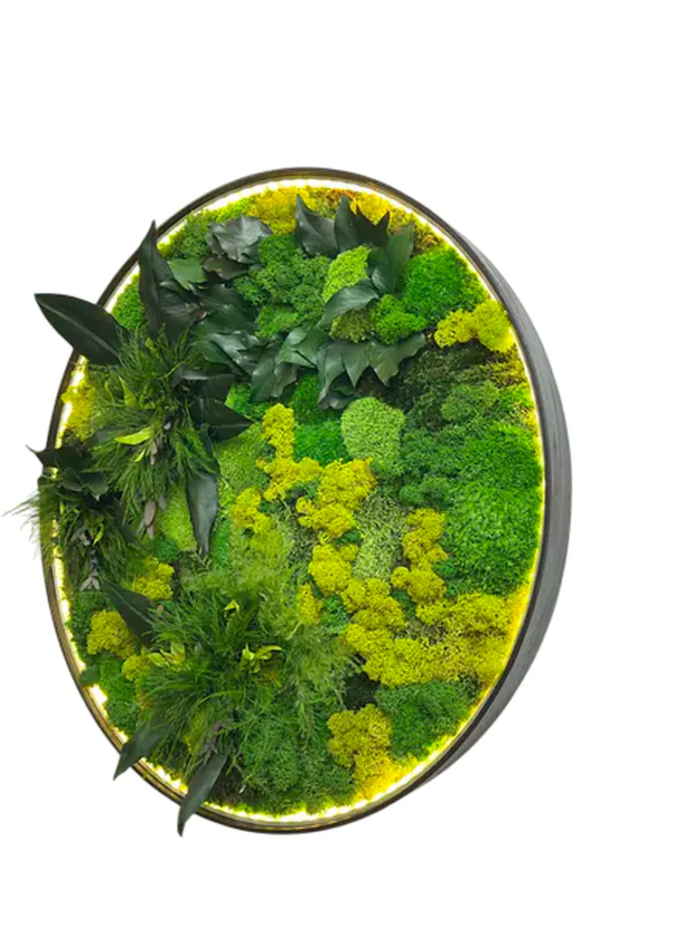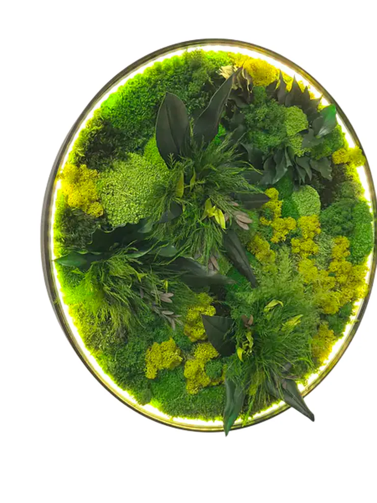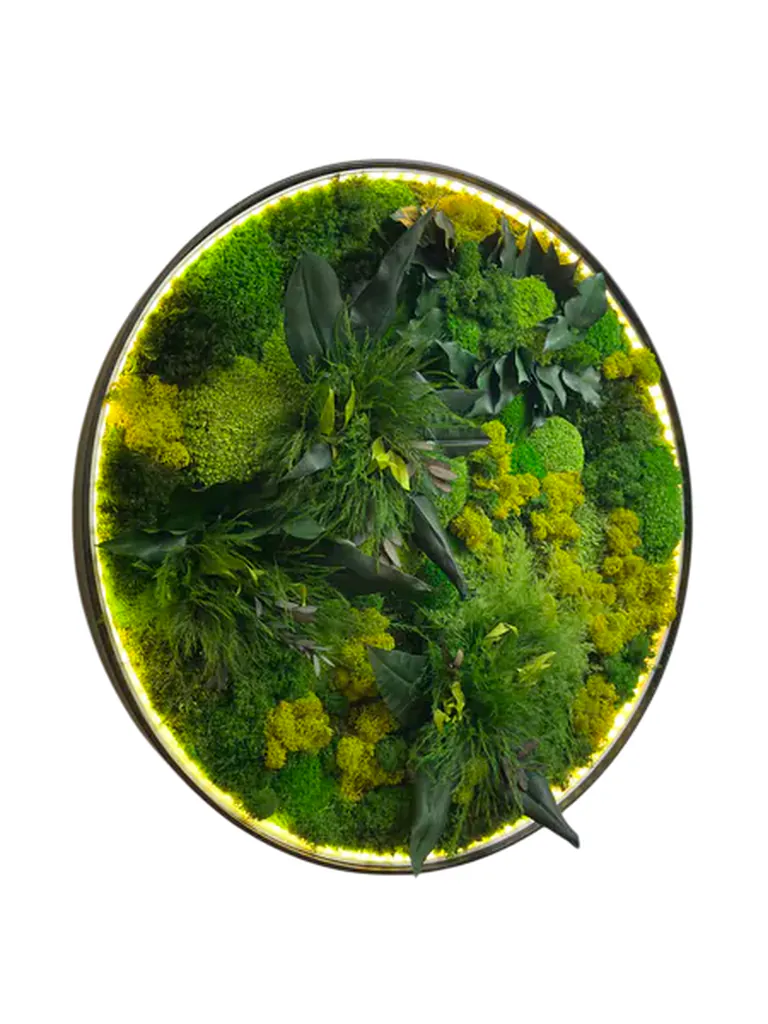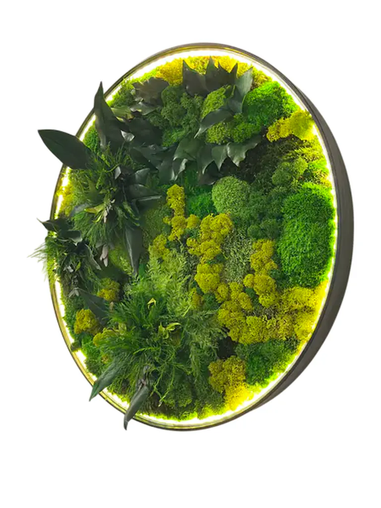 Integrované LED osvětlení dokonale zvýrazňuje uspořádání mechu a rostlin a vytváří uklidňující, nepřímý světelný zdroj. Kruhový design s podsvícením promění každý prostor v oázu pohody.