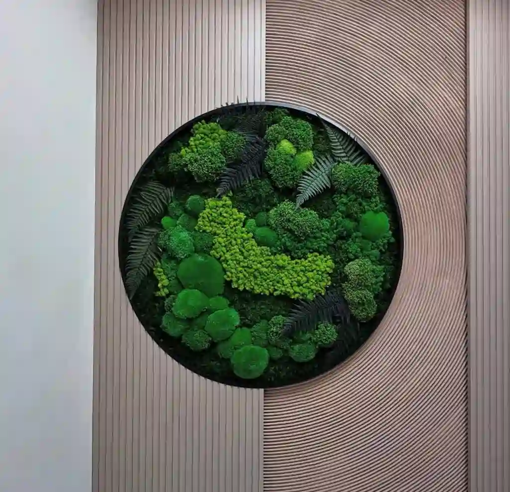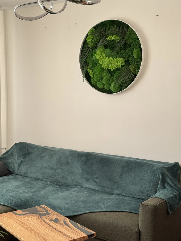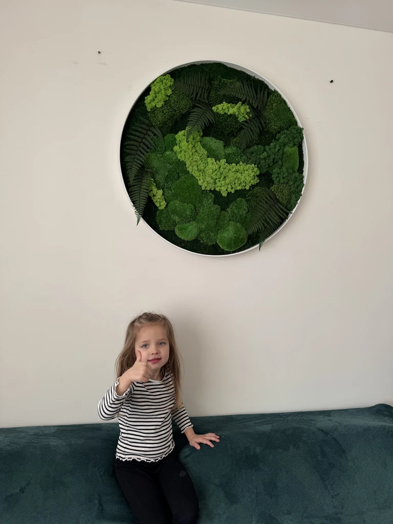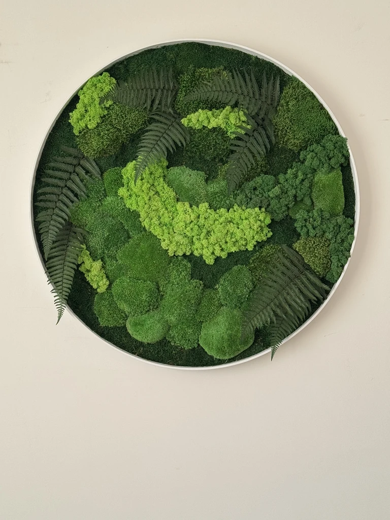 Objevte jedinečný kulatý mechový obraz skutečný, fascinující spojení umění a přírody, které každému prostoru dodává živou a uklidňující atmosféru. Tento exkluzivní obraz z mechu není jen vizuálním skvostem, ale i projevem udržitelného designu a řemeslné preciznosti. Vytvořený z pečlivě vybraných stabilizovaných mechů a skutečného kapradí, přináší nedotčenou krásu lesa přímo do vašeho domova nebo kanceláře.
