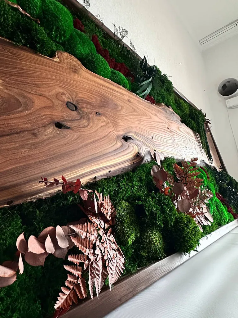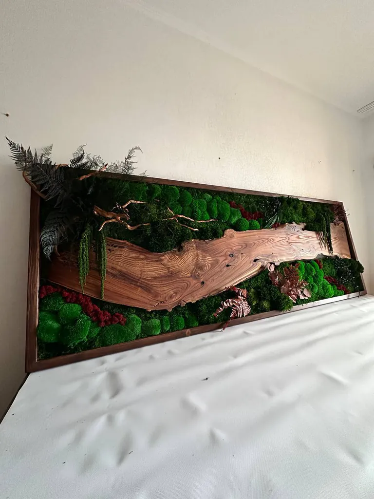 Mechový obraz s dřevem – ořechová lesní krajina: mistrovské dílo od Ekomoss