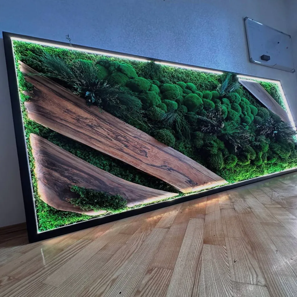 Kombinace mechu a dřeva vytváří moderní, a přitom teplou atmosféru. Ať už v obývacím pokoji, pracovně nebo hotelové hale – tento moderní mechový obraz se dokonale hodí k různým stylům interiéru.