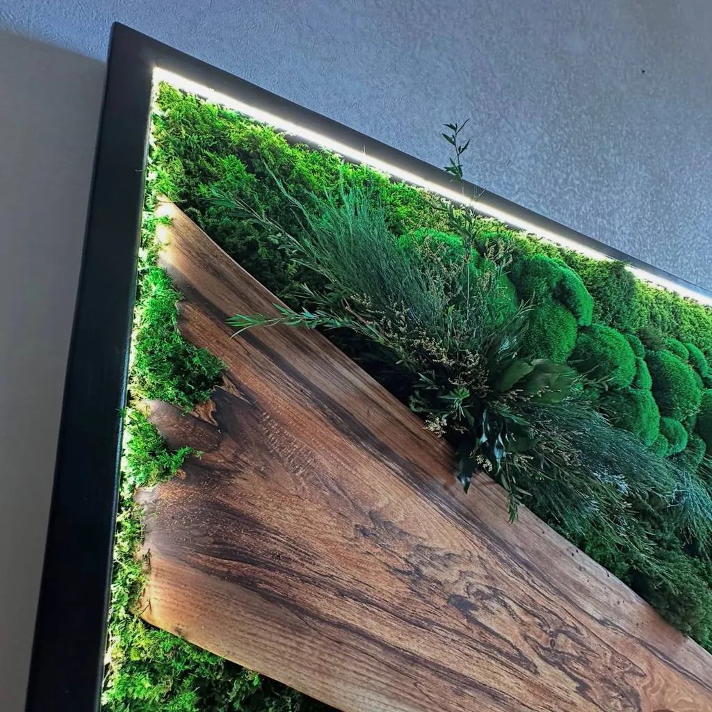 Mechový obraz s dřevěnými akcenty a rostlinami – moderní LED nástěnný obraz