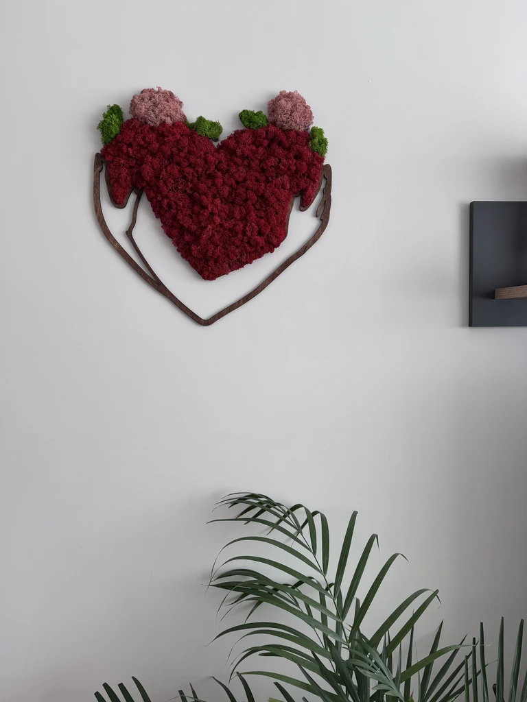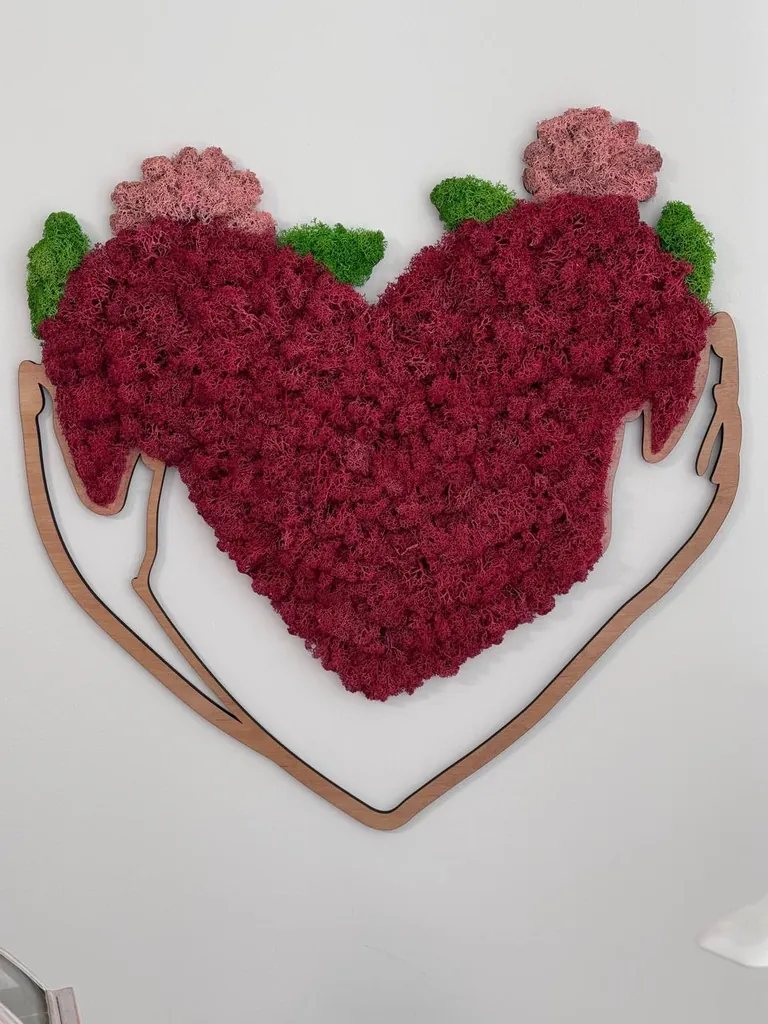 Mechové srdce je elegantní volbou pro svatební dekorace. Zelené, červené nebo růžové mechové obrazy vytvářejí romantickou atmosféru a lze je jednoduše umístit jako stolní dekoraci, obraz na stěnu či součást fotostěny.