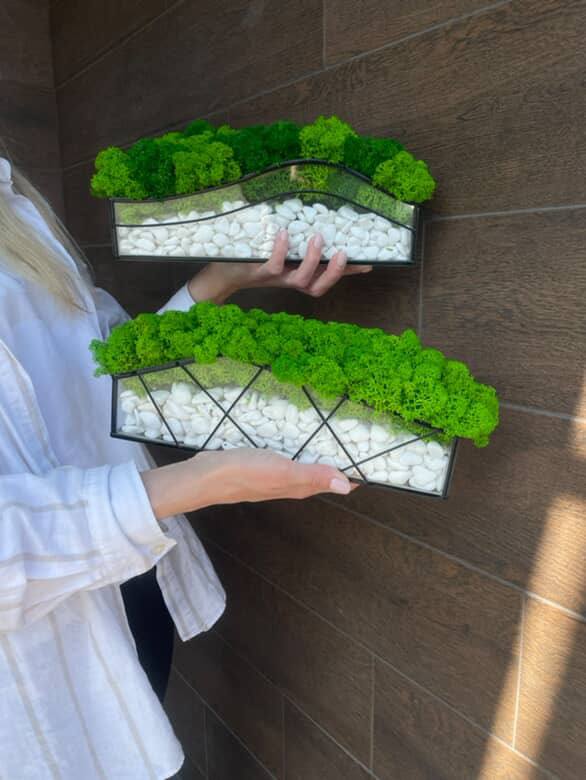 Tato kombinace vytváří harmonický kontrast mezi průhledným sklem, bílými kameny a živým mechem. Každý kus se tak stává poutavým doplňkem, ať už v obývacím pokoji, kanceláři nebo jako originální dárek.