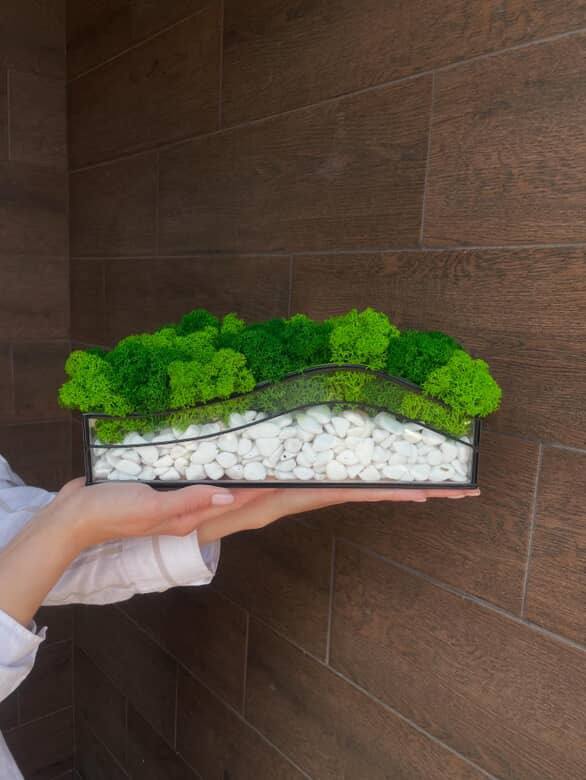 Tento mech ve skle s bílými kameny je výjimečný dekorativní prvek, který dokonale spojuje přírodu s moderním designem. Základem je kvalitní skleněná nádoba v pravoúhlém tvaru. Uvnitř se nachází vrstva dekorativních bílých kamenů, která dodává eleganci a svěžest. Nad nimi je pečlivě vybraný islandský mech, jehož svěží zelená barva přináší kousek přírody do vašich prostor.