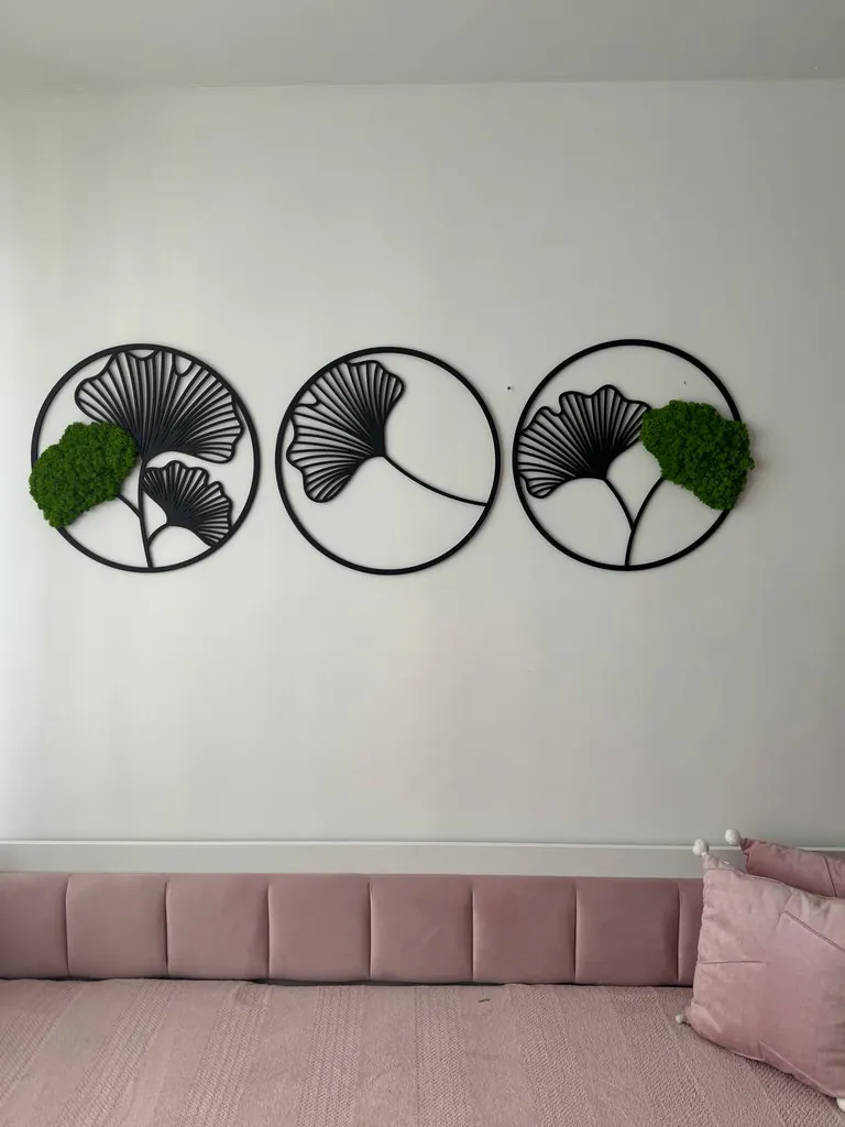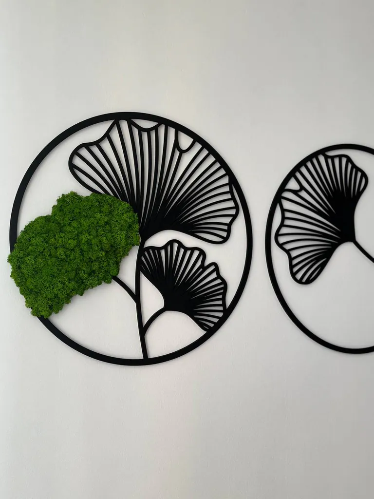 Tato moderní dekorace spojuje přírodu a design v dokonalé harmonii. Třídílná sada v kulatém provedení zobrazuje stylizované listy Ginkgo a je zdobena pravým, konzervovaným islandským mechem. Přírodní struktura mechu přináší život a svěžest do každé místnosti – bez potřeby údržby.