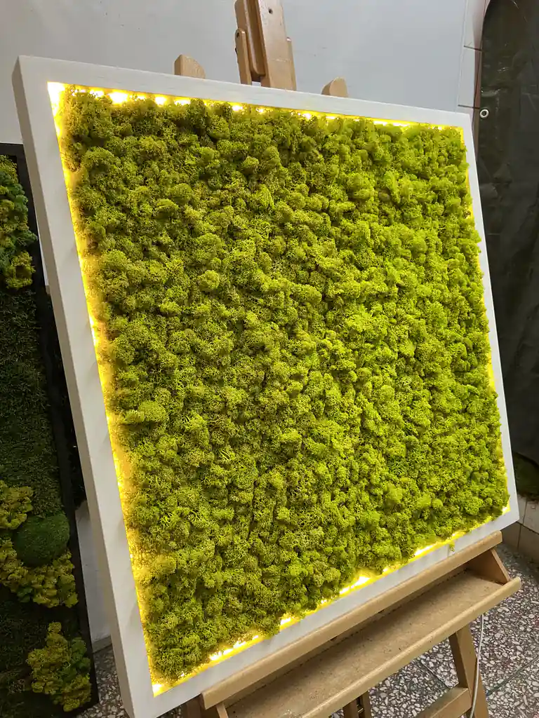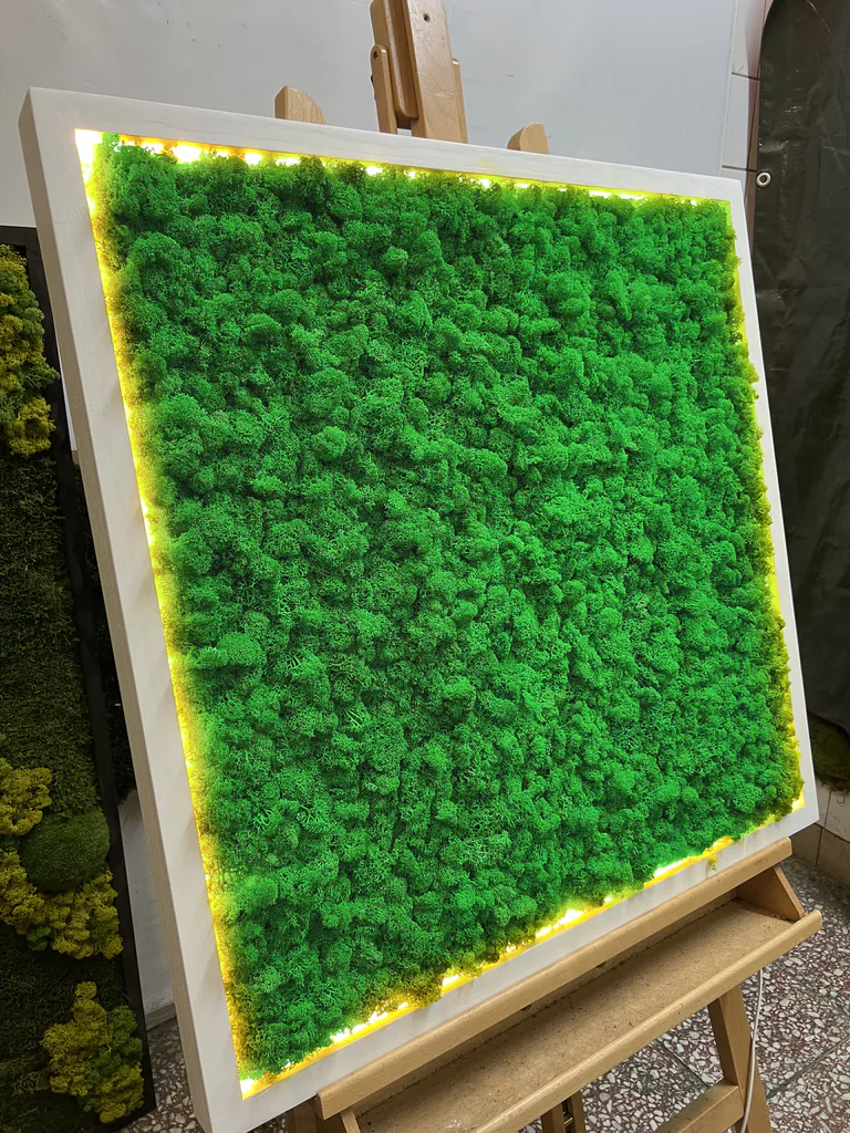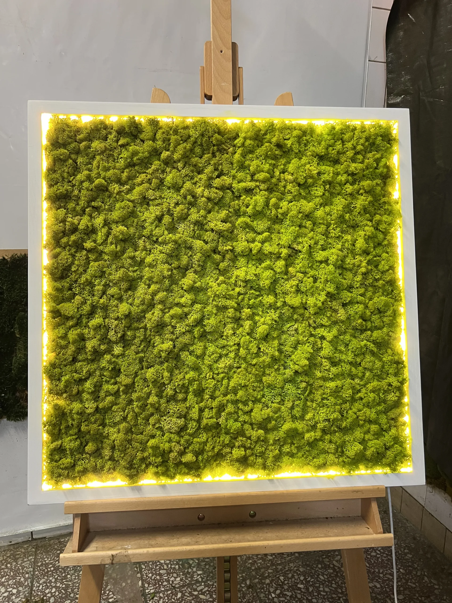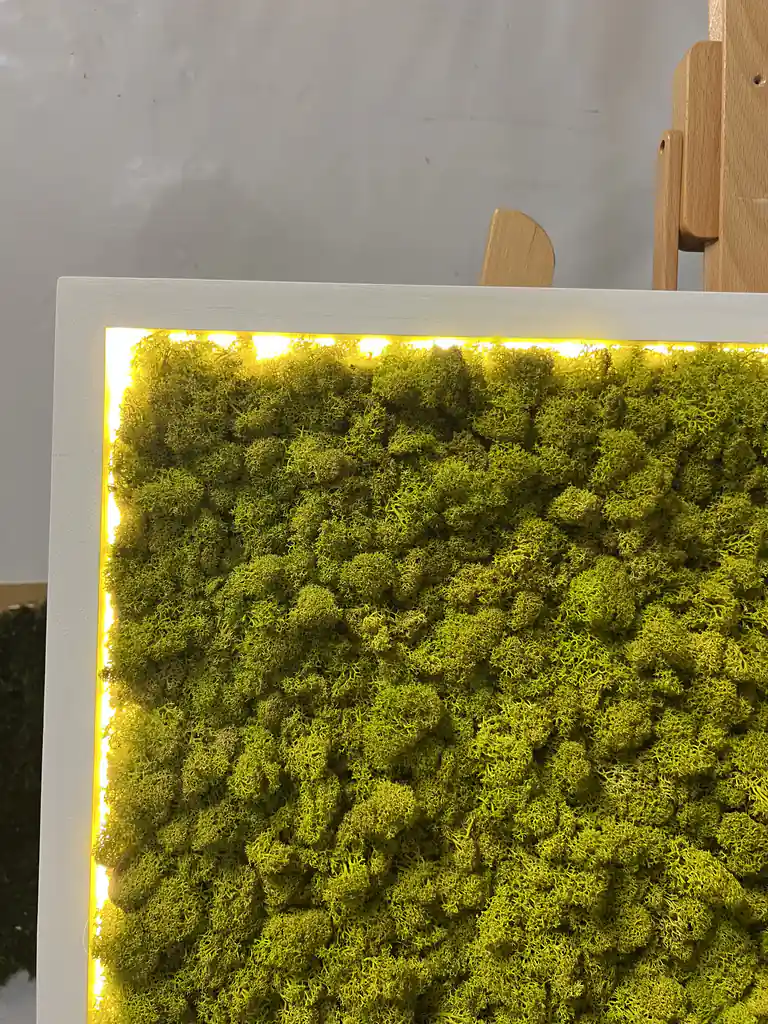 Obraz z mechu s islandským mechem a LED osvětlením je stylový a moderní způsob, jak do vašeho domova přinést přírodní prvky. Použitý islandský mech – také známý jako sobí mech nebo lišejník – je konzervovaný přírodní materiál s měkkou, jemnou strukturou, dostupný v různých barvách. Kombinace s integrovaným LED osvětlením vytváří fascinující hru světla a přírody, která působí dojmem jak přes den, tak v noci.