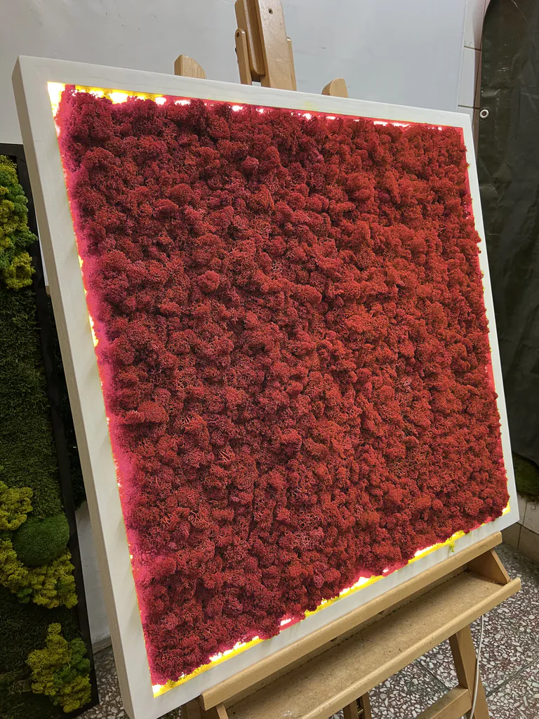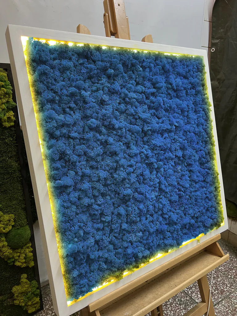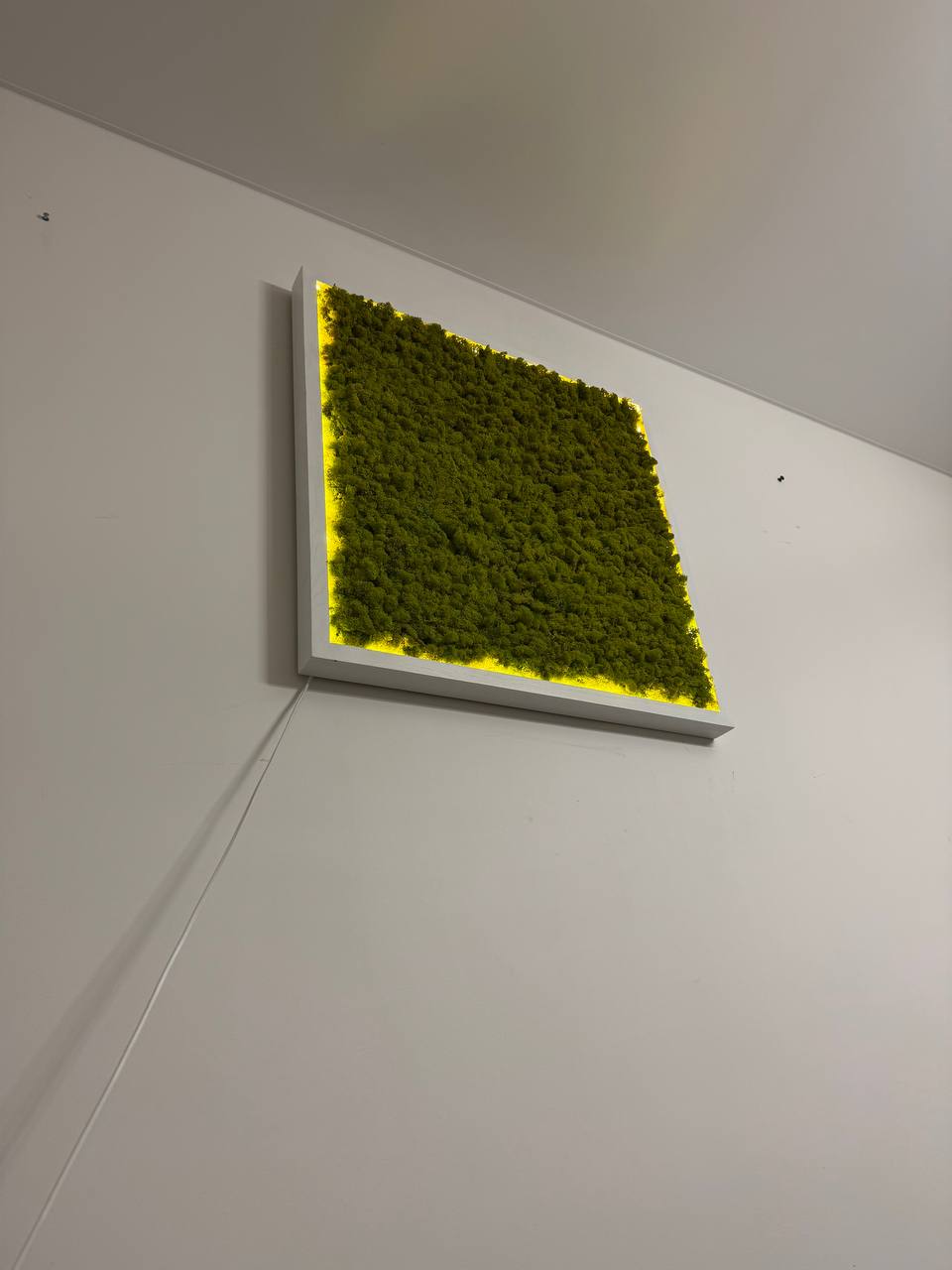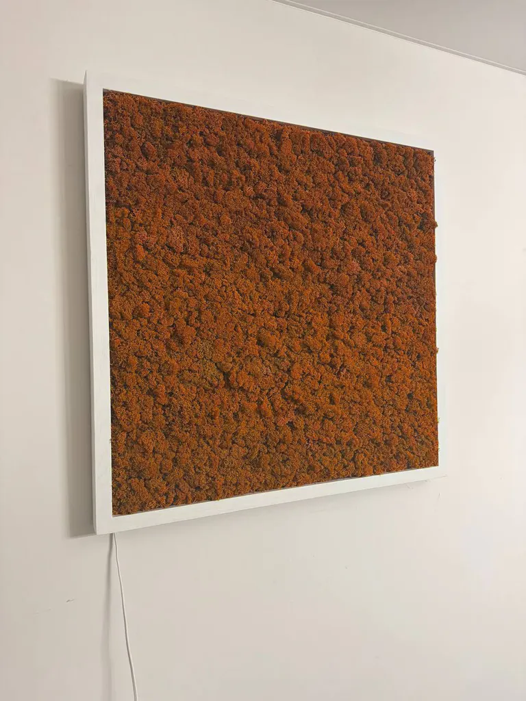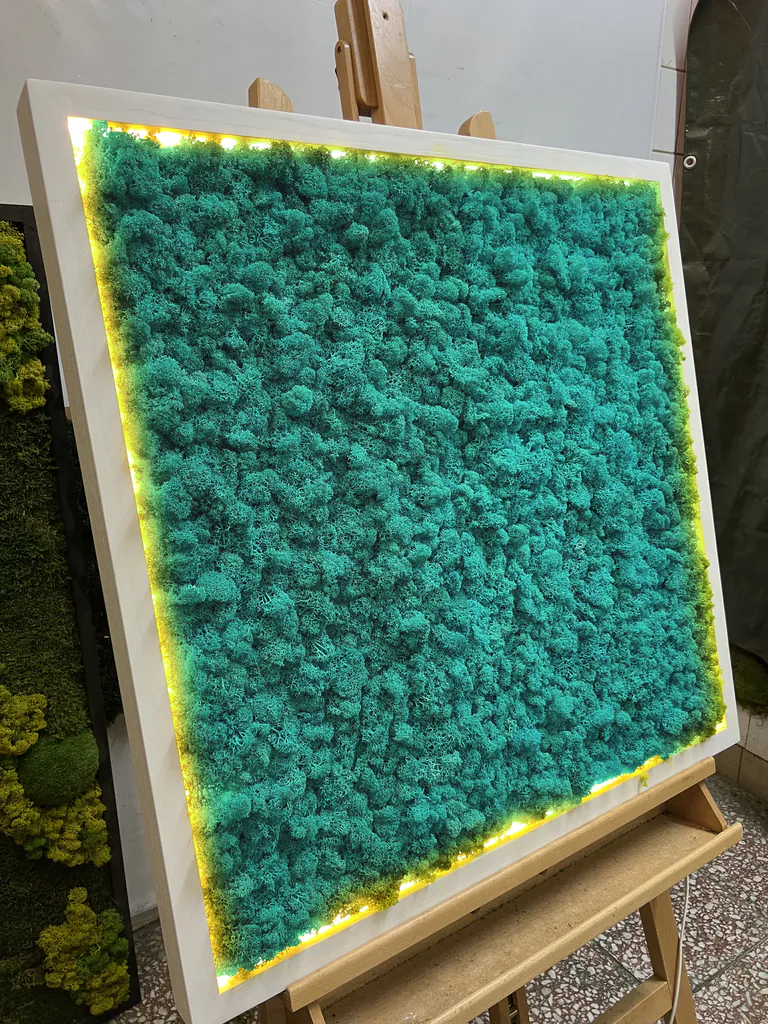 Obraz z mechu s islandským mechem a LED osvětlením je stylový a moderní způsob, jak do vašeho domova přinést přírodní prvky. Použitý islandský mech – také známý jako sobí mech nebo lišejník – je konzervovaný přírodní materiál s měkkou, jemnou strukturou, dostupný v různých barvách. Kombinace s integrovaným LED osvětlením vytváří fascinující hru světla a přírody, která působí dojmem jak přes den, tak v noci.