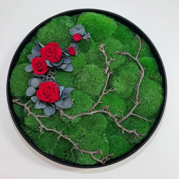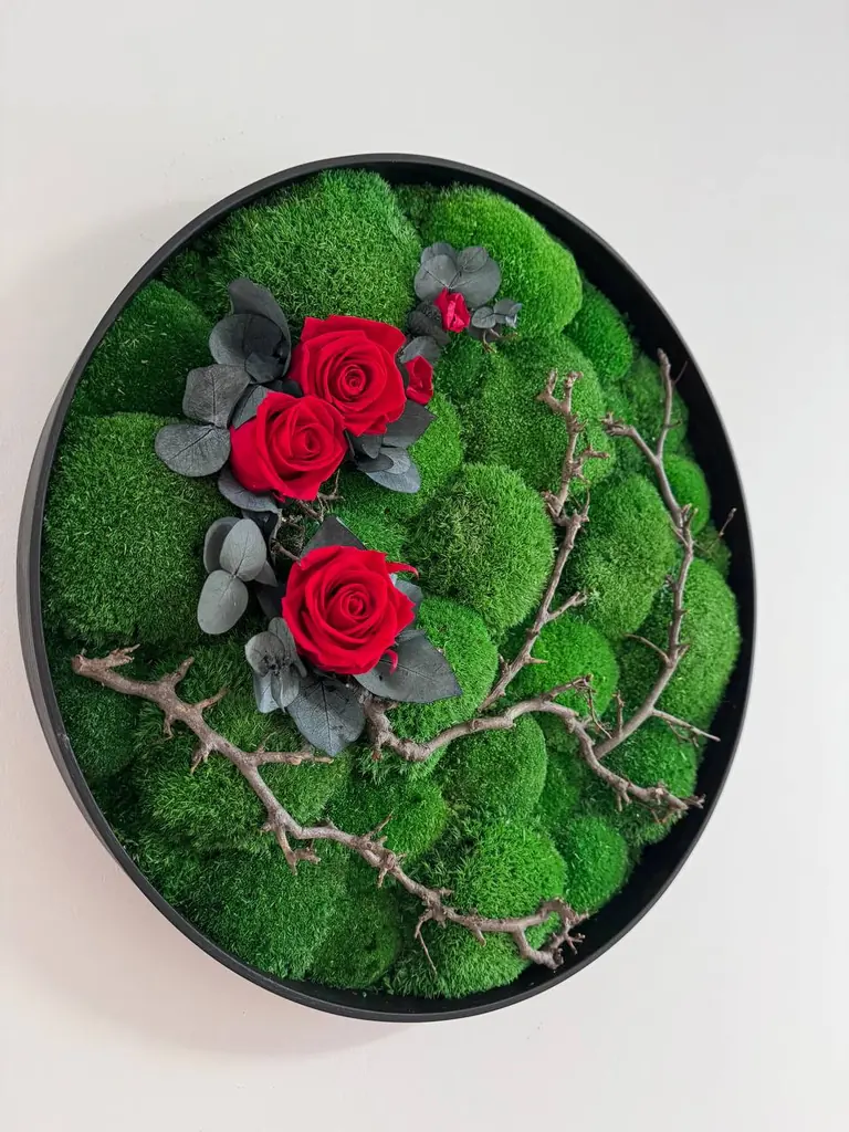 Obraz z mechu s červenými růžemi není jen dekorací – je symbolem lásky a vášně. Tmavě červené růže představují romantiku a eleganci, zatímco přírodní mech působí uklidňujícím dojmem. Tento obraz je ideální do obývacího pokoje nebo ložnice, kde vytváří intimní atmosféru.