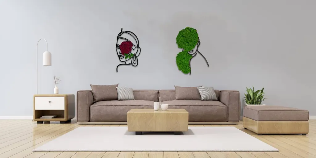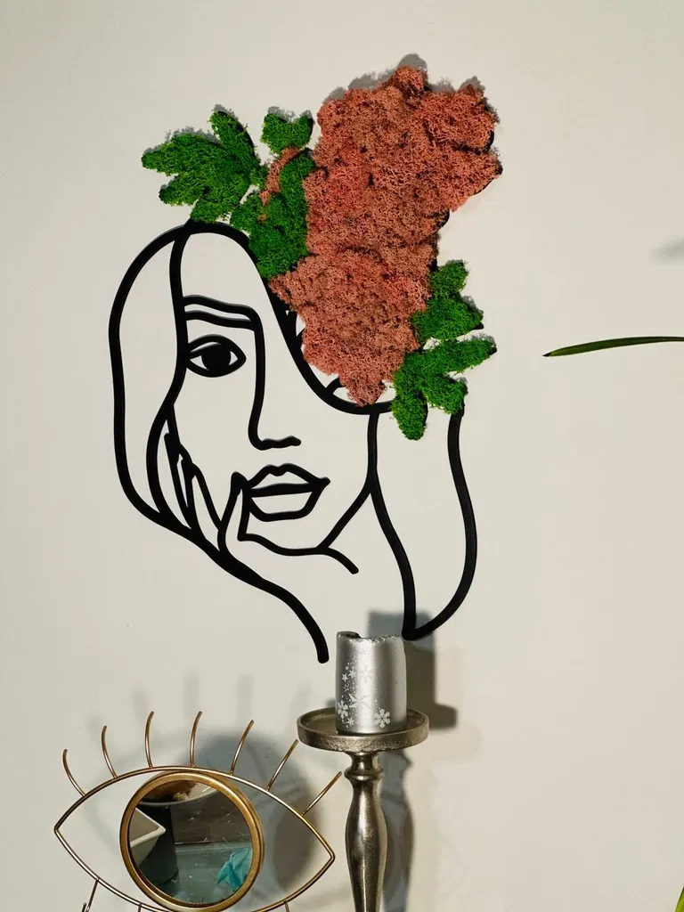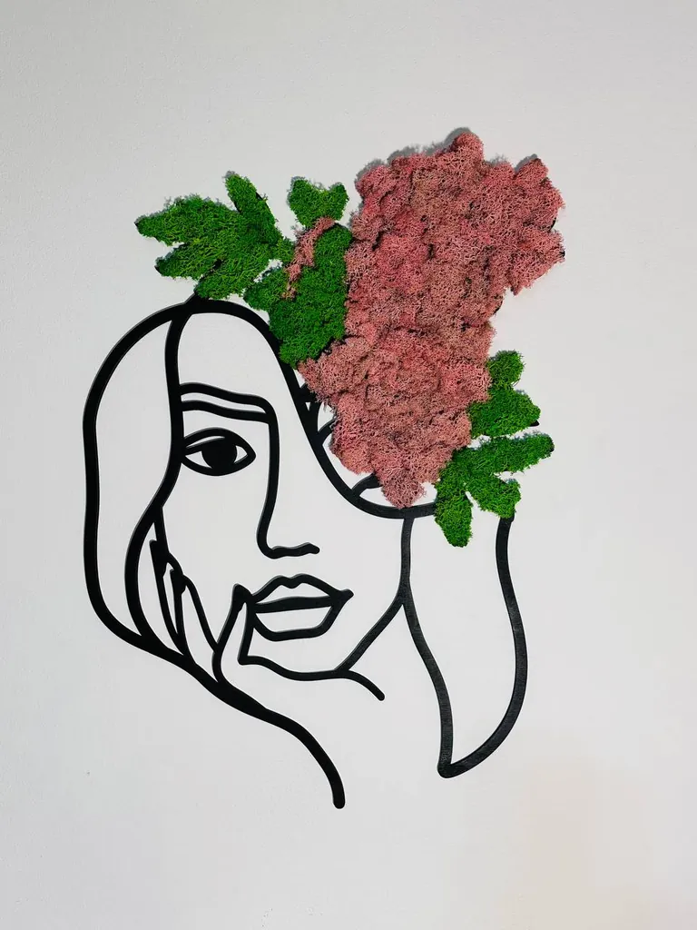 Portrét je vyroben z vysoce kvalitní překližky o tloušťce 6 mm, přesně vyřezané jemnou laserovou technologií. Silueta zobrazuje obličej ženy, jejíž hlava je harmonicky vyzdobena zeleným a jemně růžovým mechem. Tento živý a přírodní materiál přináší do vašeho interiéru barvu a svěžest a současně vytváří moderní a stylové vyznění.
