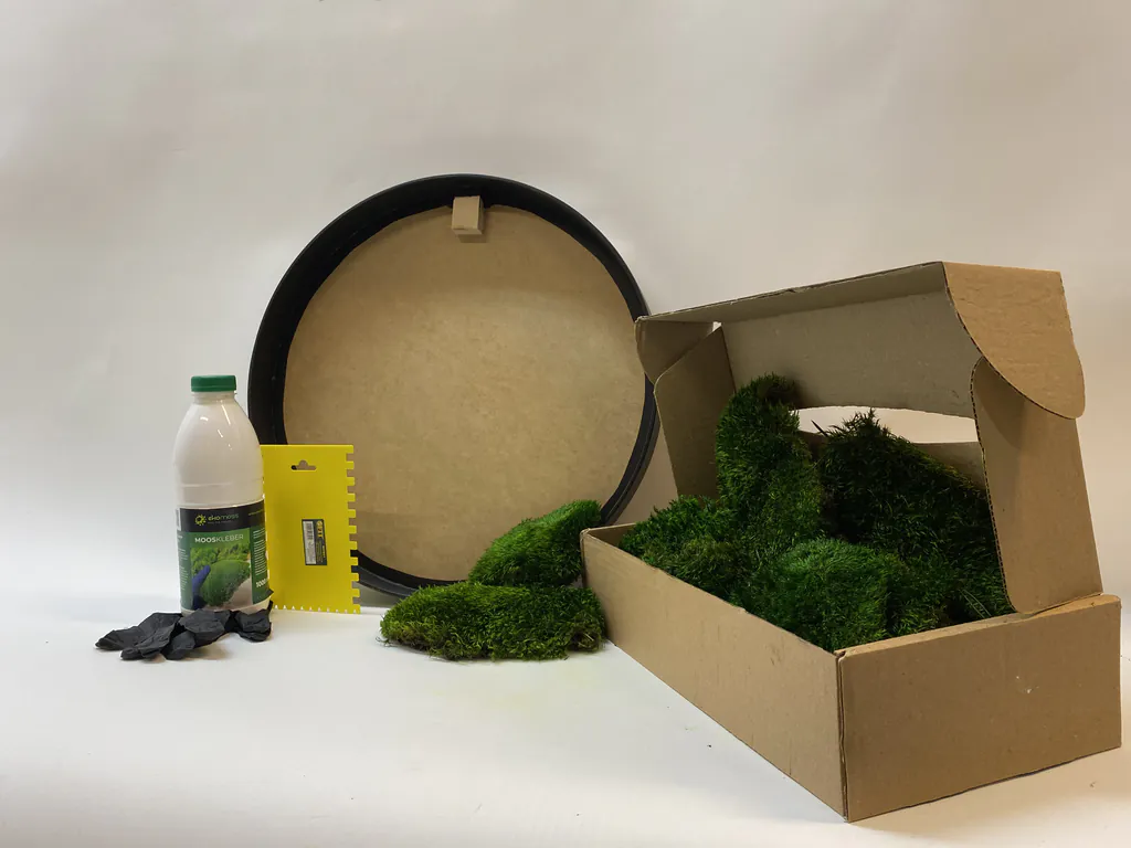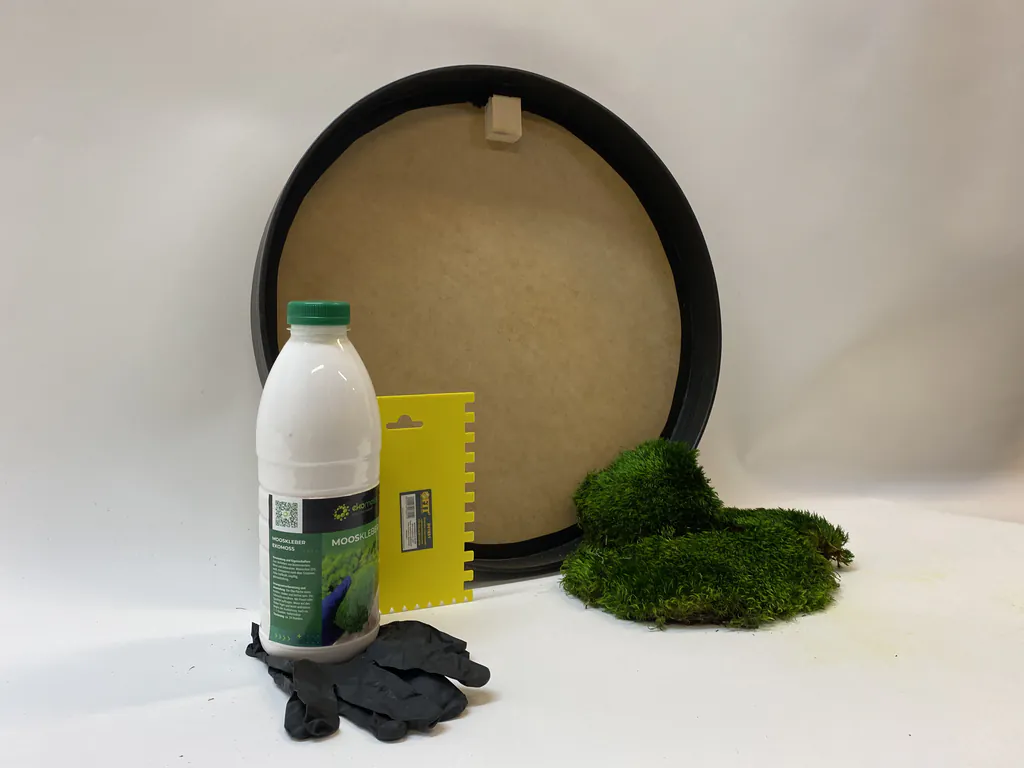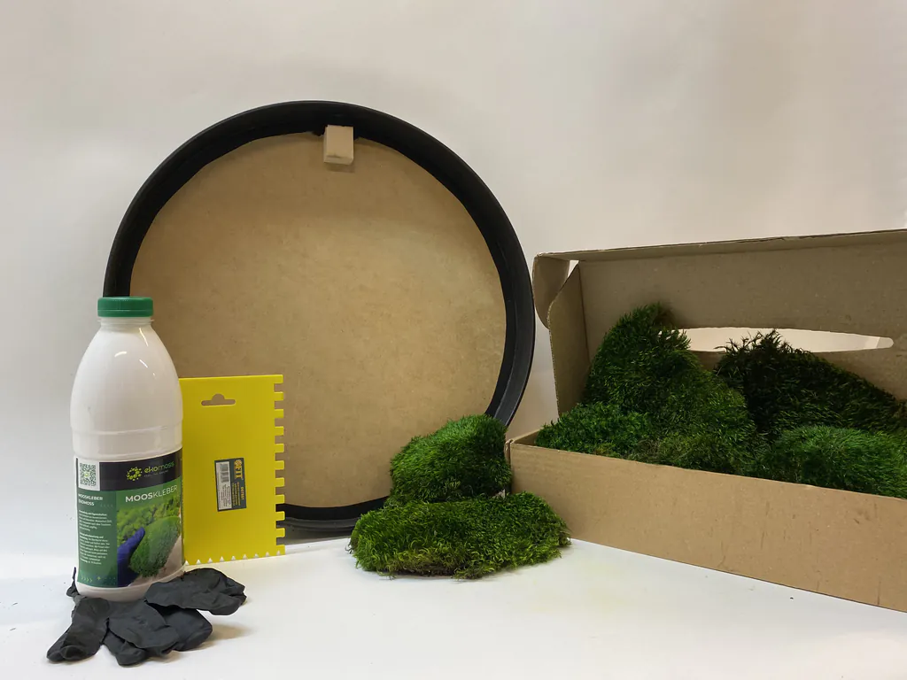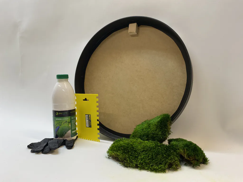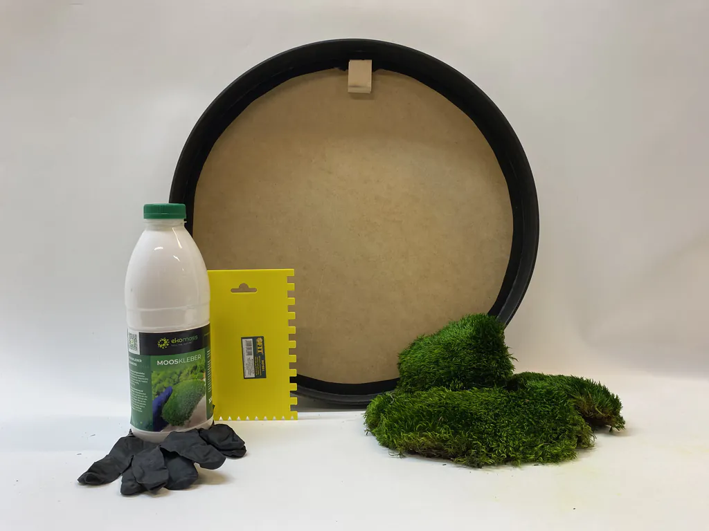 Sada nástrojů a speciální lepidlo: V balení najdete všechny potřebné nástroje: latexové rukavice a stěrku pro rovnoměrné nanesení lepidla. Naše speciální lepidlo je bez zápachu a zajišťuje pevné a trvalé spojení mezi mechem a rámem.