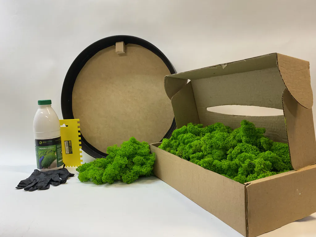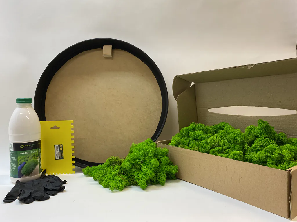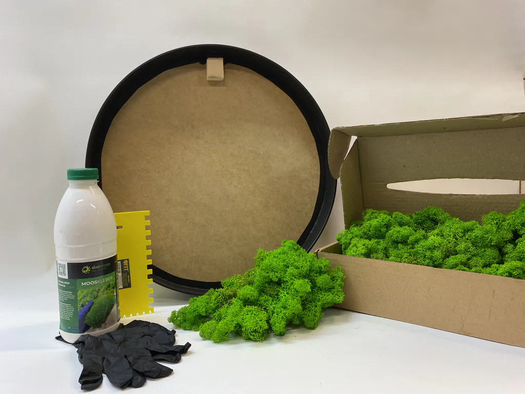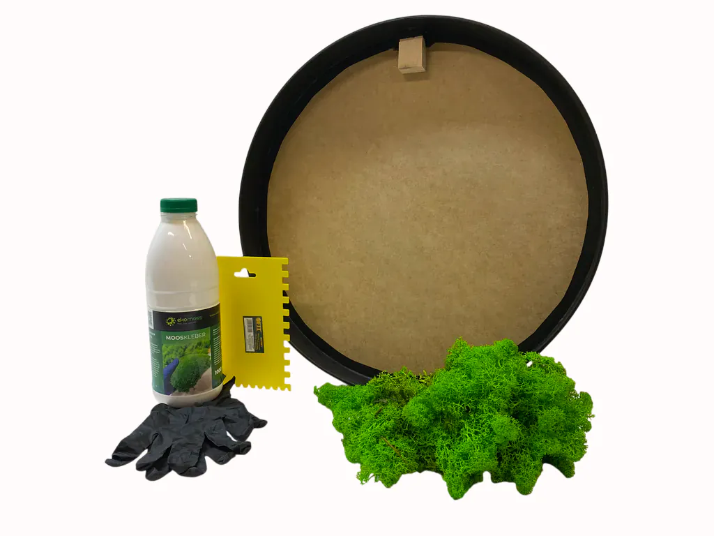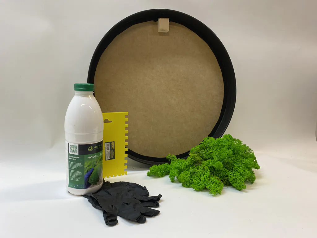 Sada nástrojů a speciální lepidlo: V balení najdete všechny potřebné nástroje: latexové rukavice a stěrku pro rovnoměrné nanesení lepidla. Naše speciální lepidlo je bez zápachu a zajišťuje pevné a trvalé spojení mezi mechem a rámem.